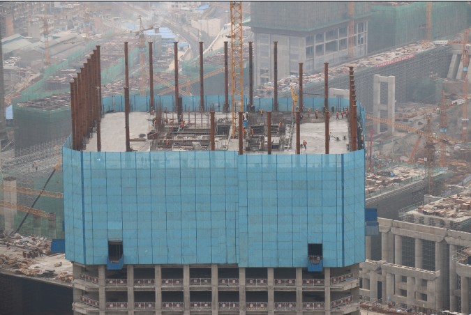 西侧仍在浇捣混凝土,东侧紧锣密鼓地绑扎墙柱钢筋,这是3月26日贵阳双子塔西塔楼面的施工场景。