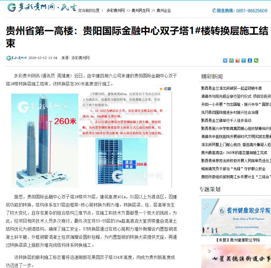 多彩贵州网:贵州省第一高楼 贵阳国际金融中心双子塔1#楼转换层施工结束