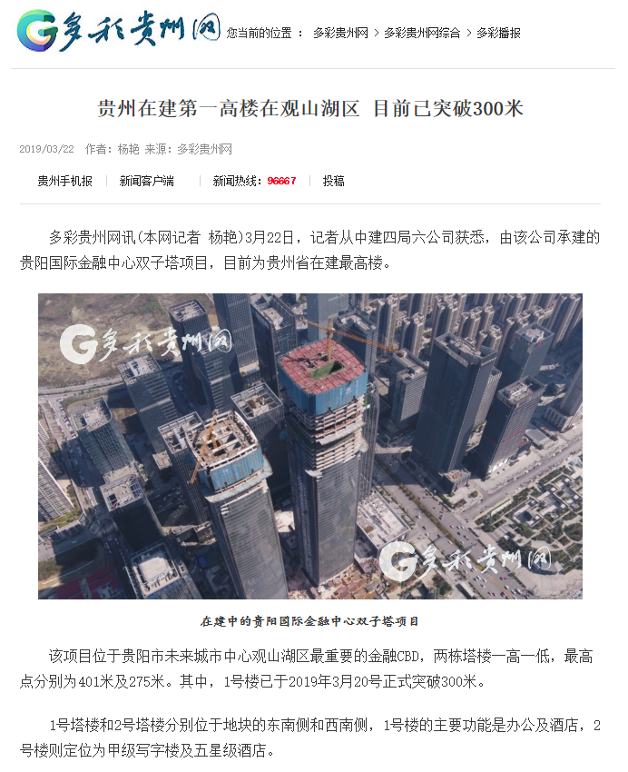 多彩贵州网:贵州在建第一高楼在观山湖区 目前已突破300米